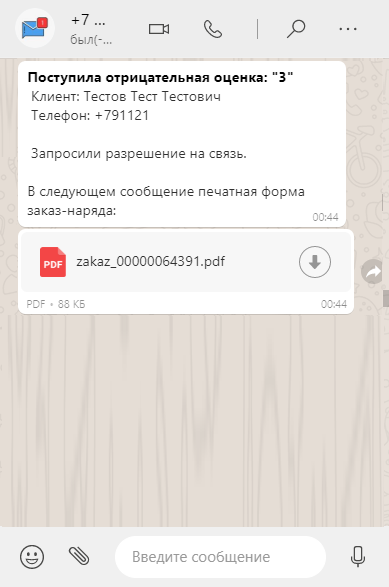 Ответственный(е) сотрудник(ки) получат оповещение в случае если клиент, который оставил плохую оценку, будет готов общаться с менеджером. Так же будет отправлена печ.форма заказа из CRM-системы по этому клиенту, чтобы было можно быстро ознакомиться с заказом.
