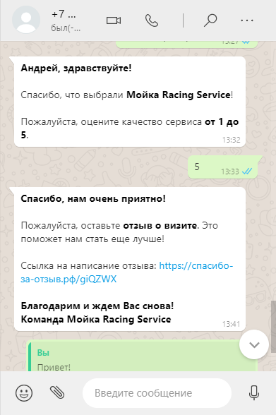 WhatsApp бот пишет клиенту, и он оставляет положительную оценку